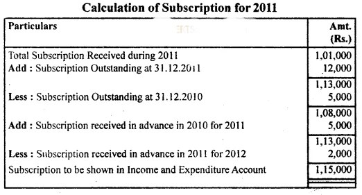 The Club has 500 members each paying @ Rs. 200 as annual subscriptions. Subscriptions outstanding as on December 31,2010 are Rs. 6,000. Calculate the amount of subscriptions to be shown as income in the Income and Expenditure Account for the year ended December 31,2011 and show the relevant data in the Balance Sheet as on that date.